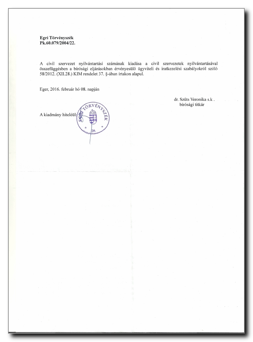 A szervezet(1) bármely szervének törvénysértő határozatát bármely tag - a tudomására jutástól számított - 30 napon belül a Heves Megyei Bíróság előtt megtámadhatja.